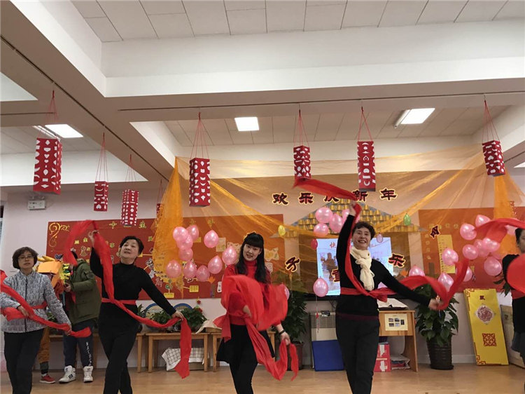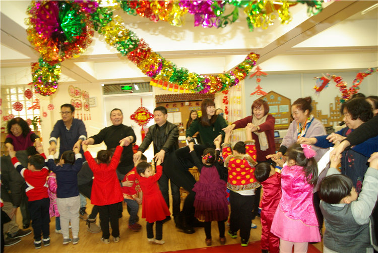 老师、家长、孩子一起扭秧歌、舞龙舞狮!