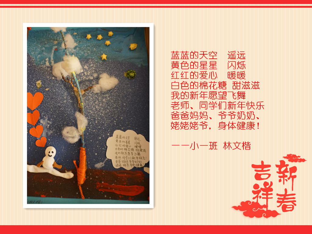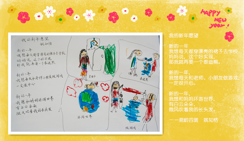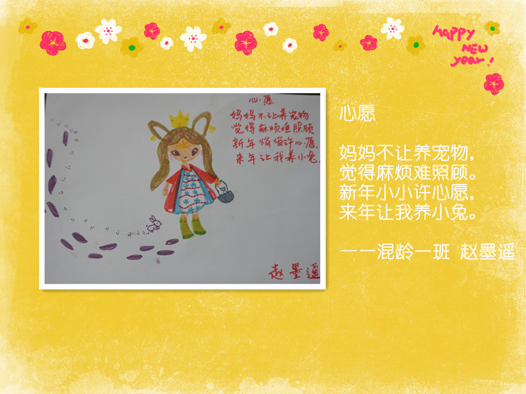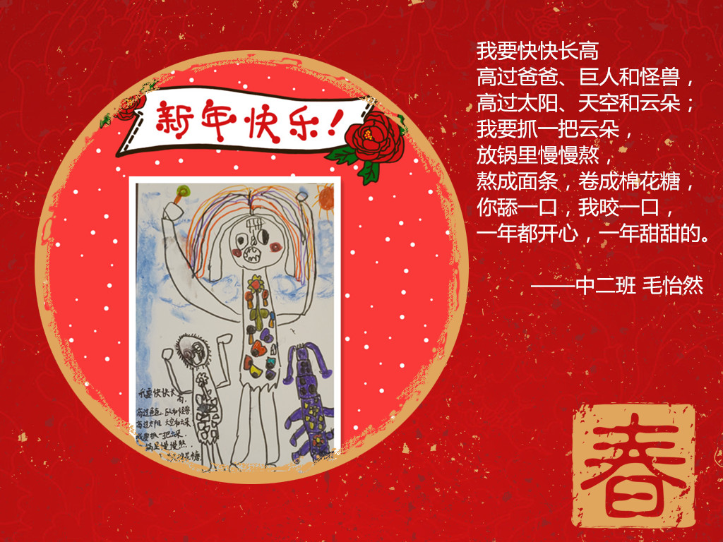 喜庆的新年要到了,过去的一年里,在家长的配合下,我们收获了孩子们的欢声笑语,看到了他们在各个方面可喜的成长,我们由衷地感到幸福!在新的一年即将到来之际,我们用“新年愿望”亲子诗画展的方式,为孩子们期许一个美好未来……