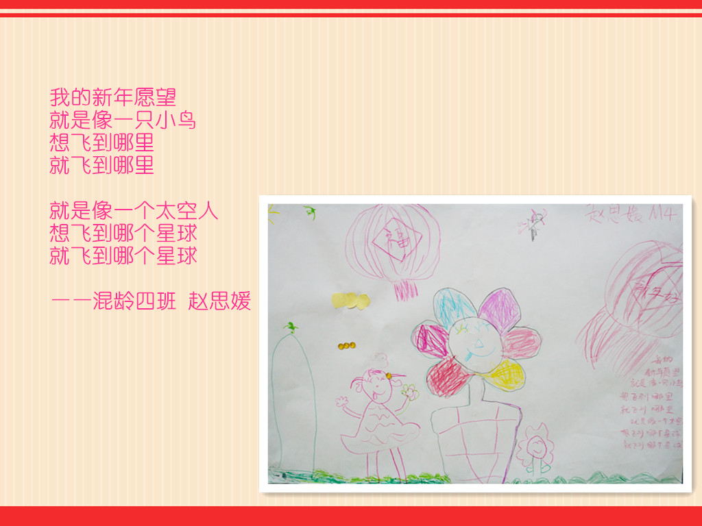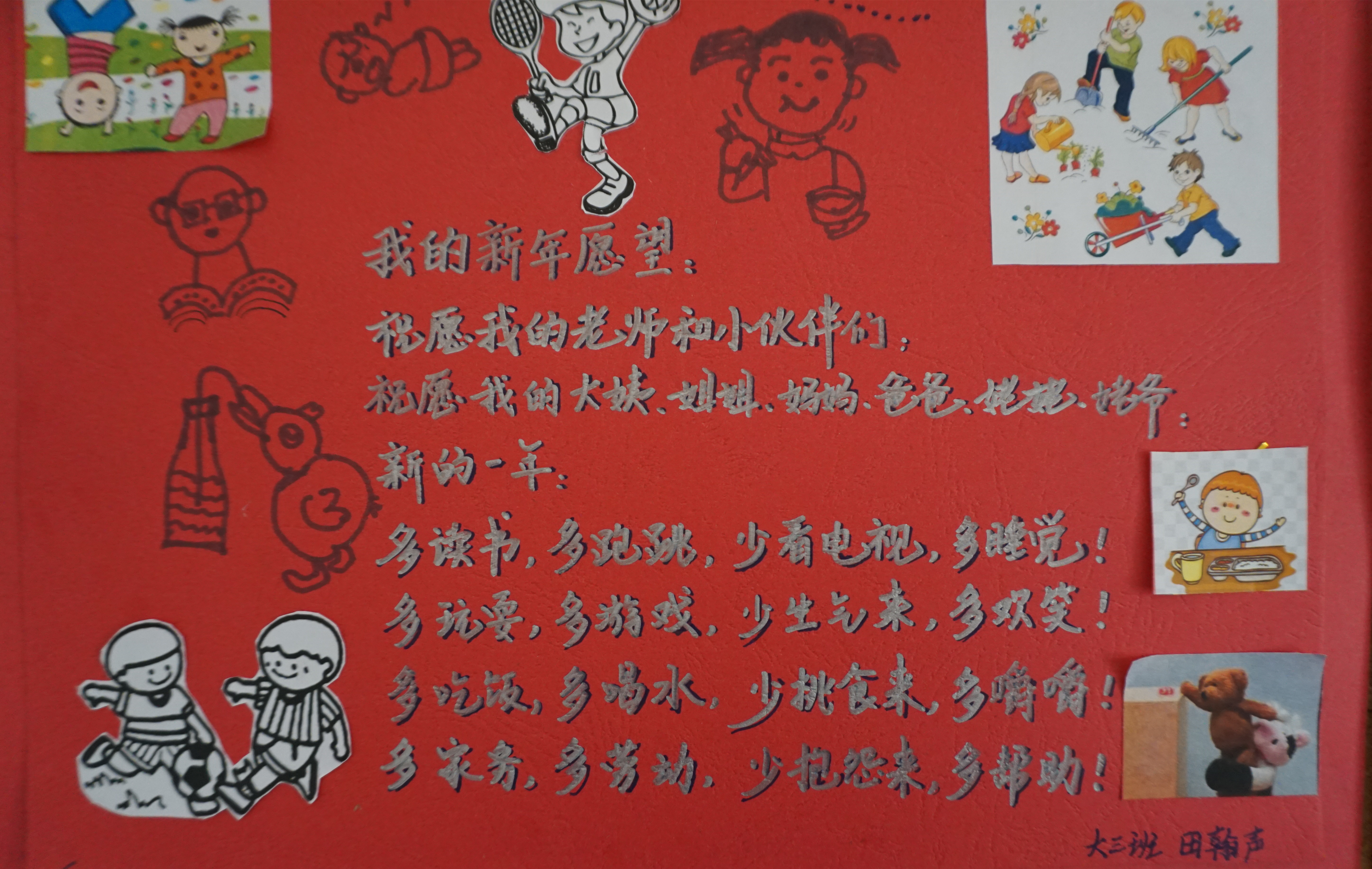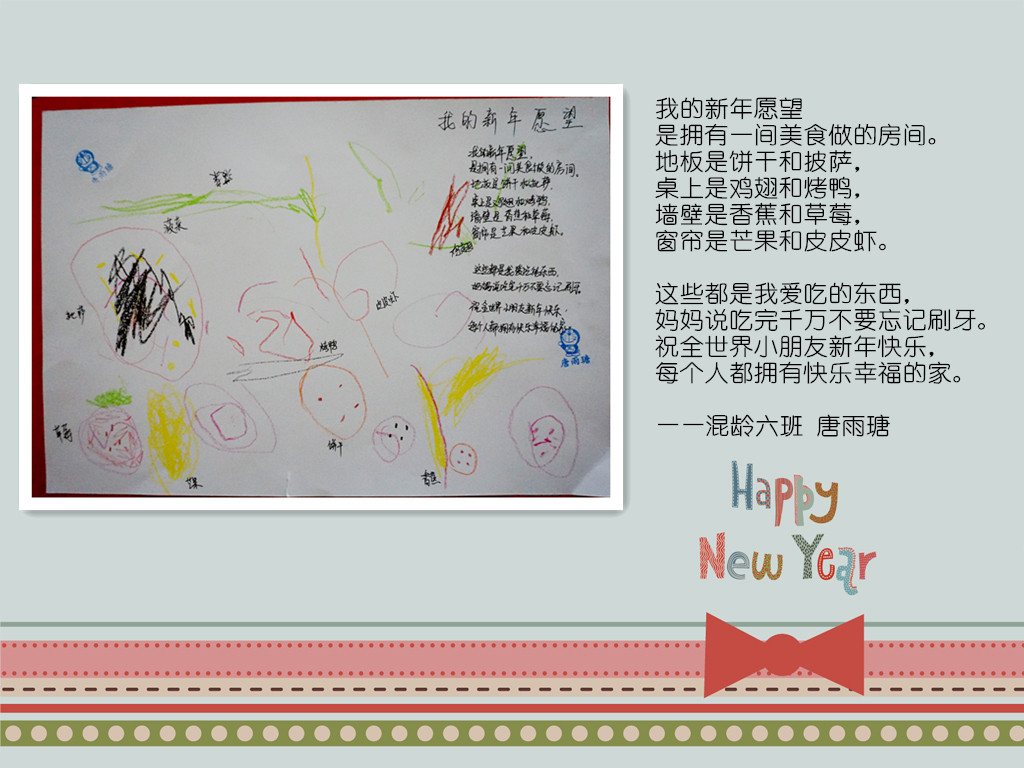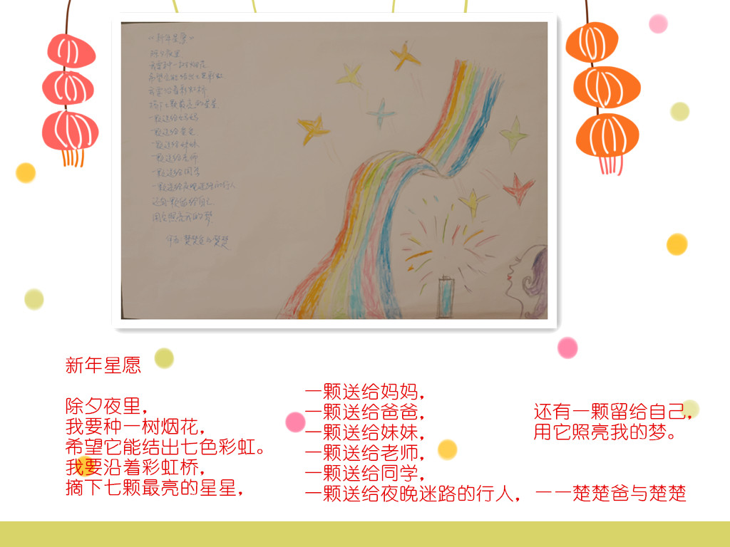 喜庆的新年要到了,过去的一年里,在家长的配合下,我们收获了孩子们的欢声笑语,看到了他们在各个方面可喜的成长,我们由衷地感到幸福!在新的一年即将到来之际,我们用“新年愿望”亲子诗画展的方式,为孩子们期许一个美好未来……