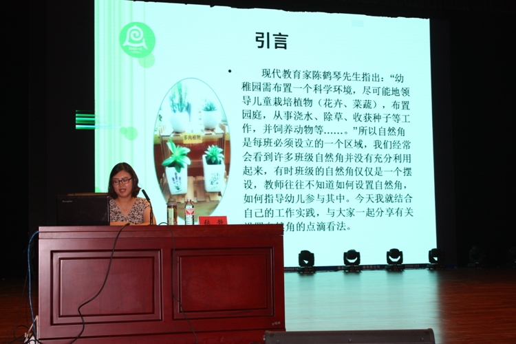 当天下午的讲座内容围绕区域创设进行,谢红玉老师和张静老师分别做了题为《阅读区的创设》和《自然角的创设》的报告。临沂的园长、教师受益良多。她们说,“区域活动一直是我们的弱项,今天的讲座正是我们需要的,听完回去后,我们一定会好好的借鉴运用!”
