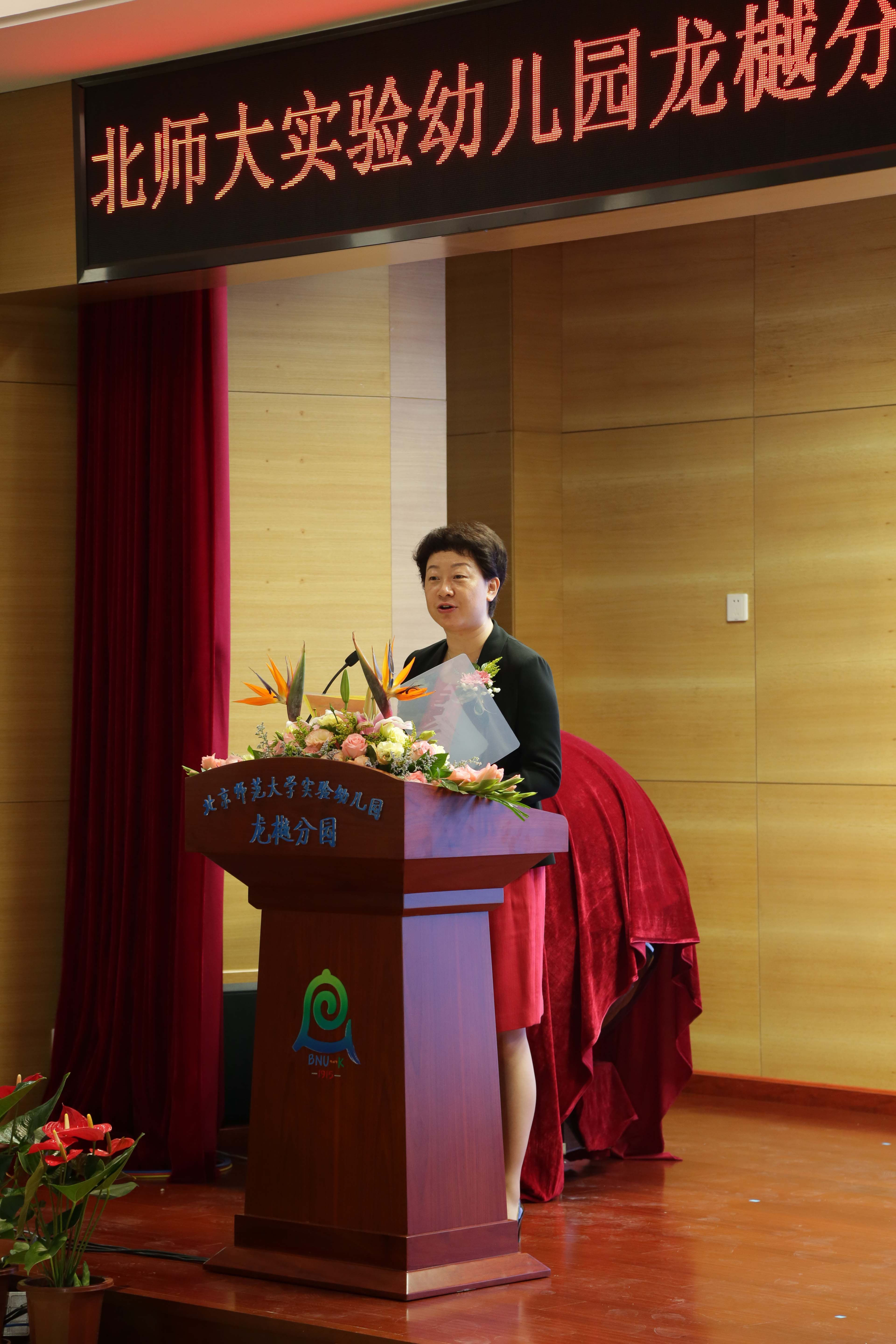 龙樾分园的幼儿用小主人的热情接待和童真的表演表达了对与会嘉宾的欢迎与感谢。伴随着“5-4-3-2-1”的倒计时声,启动球点亮,龙樾分园正式开园!北师大实验幼儿园总园长黄珊发表讲话指出:百年来北师大实验幼儿园一直秉承着“以儿童为本”的教育理念,力图将优质的早期教育惠及更多儿童,服务更多翘首以盼的家长。短短试开园几个月时间,龙樾分园呈现出家园默契配合、社区和谐共育的美好局面。希望各方携手,为推进海淀区学前教育健康可持续发展,为办好让人民满意的学前教育而倾心注力!